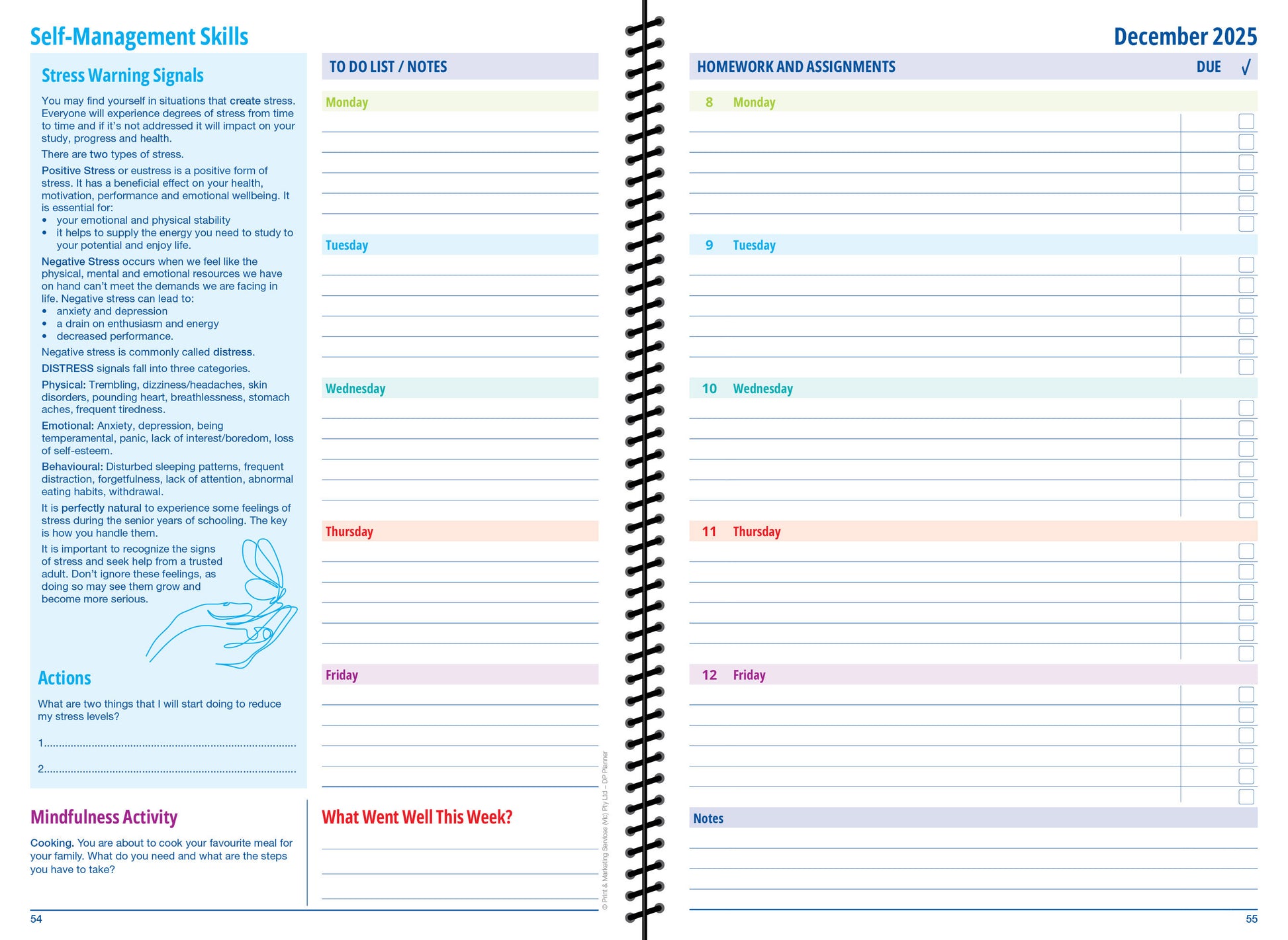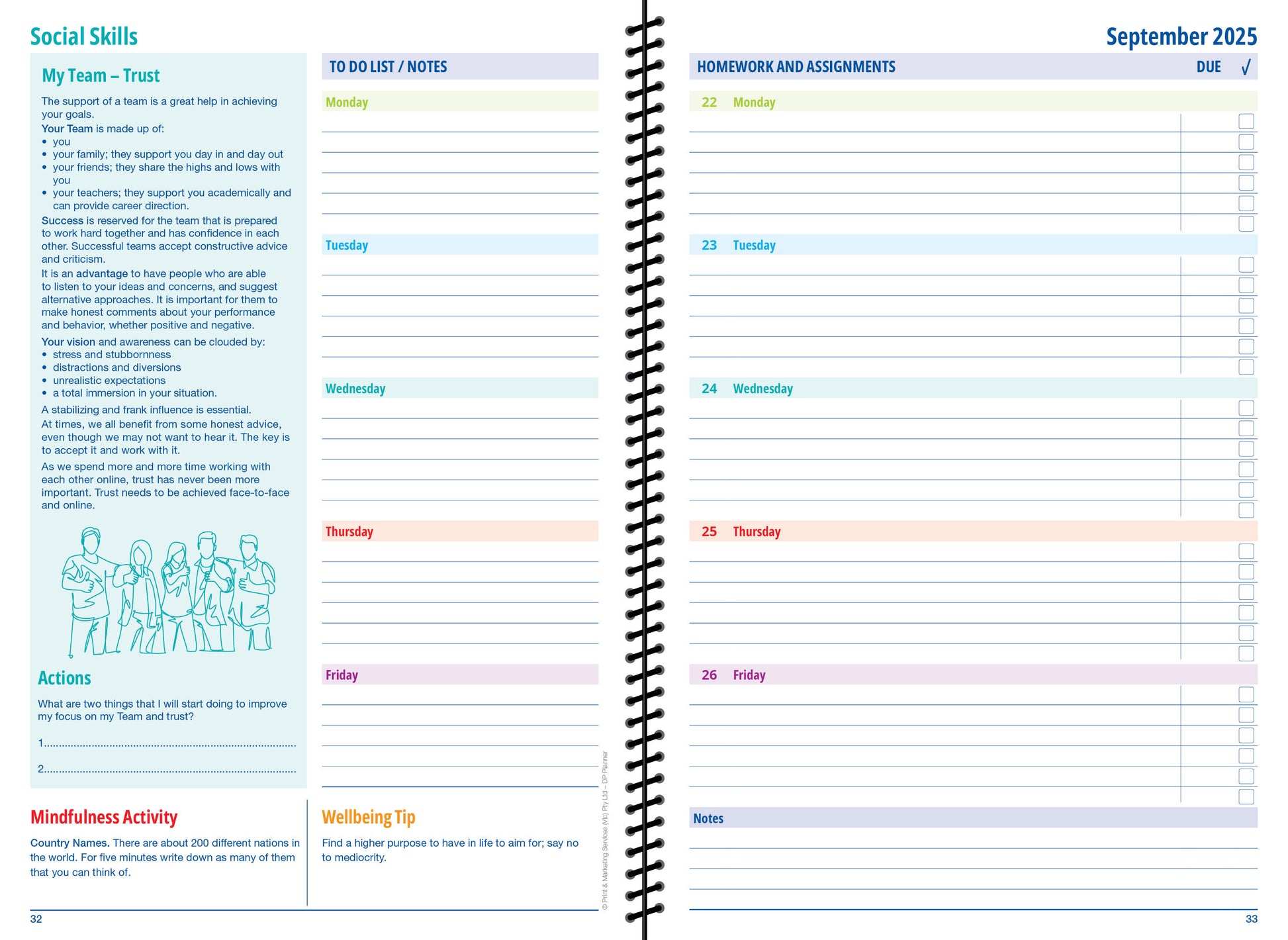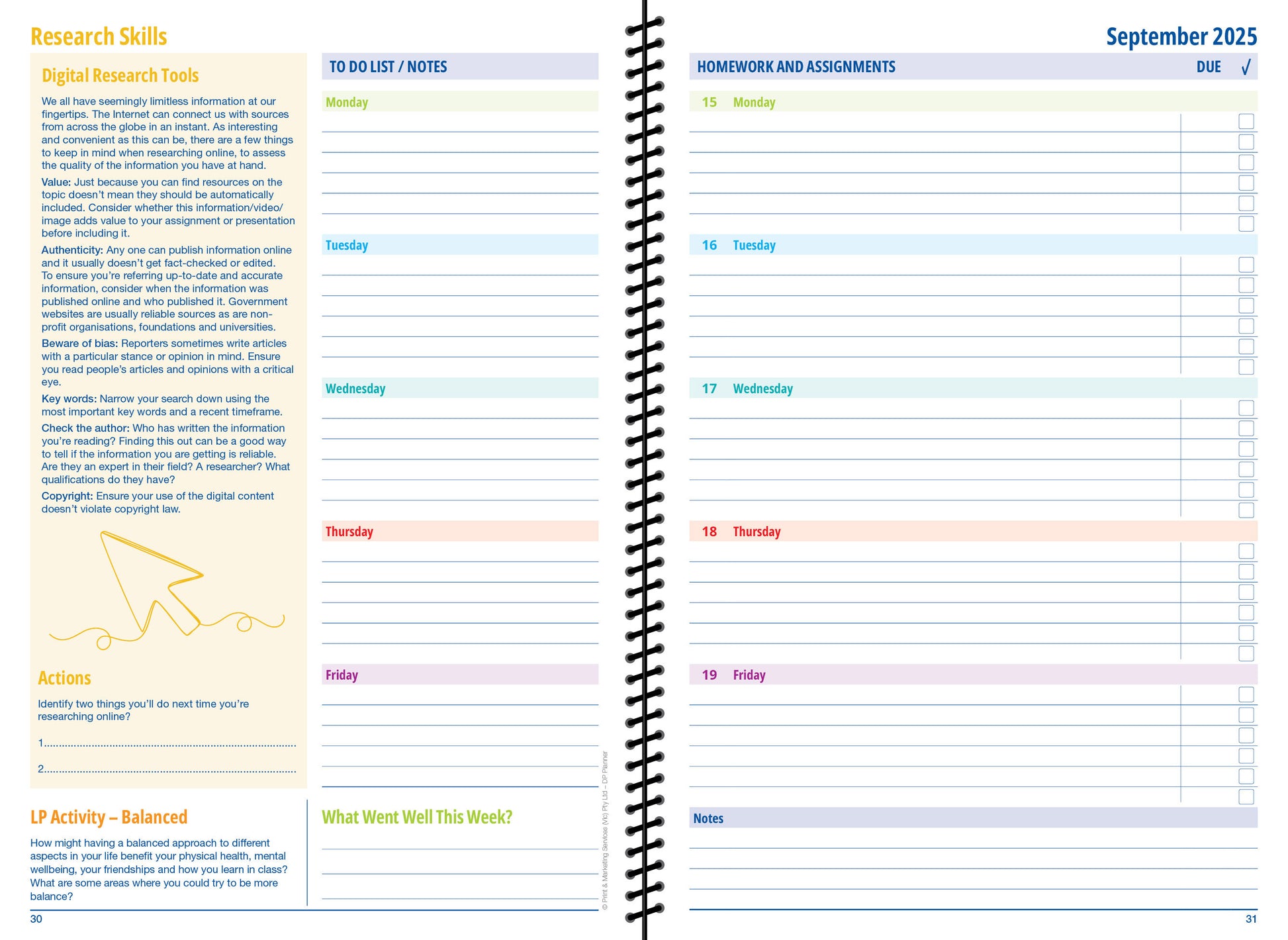 Designed specifically for IB Diploma Programme (DP) students, this 2025 IB Diploma Student Planner supports success by integrating wellbeing, motivation, and academic strategies into daily routines. Each week, students will engage with key Approaches to Learning (ATL) skills alongside structured reflection and goal-setting tools.